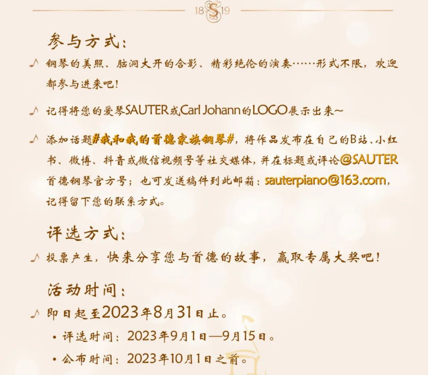 ④添加話題 #我和我的首德家族鋼琴# 發(fā)表在您的個(gè)人社媒頻道,并在標(biāo)題或評論@首德鋼琴官方號(hào);或也可發(fā)送稿件到此郵箱:sauterpiano@163.com,記得留下您的聯(lián)系方式。